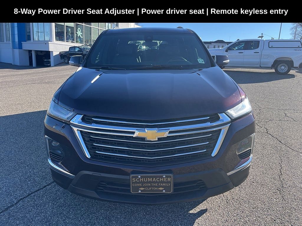 Schumacher Chevrolet of Clifton is very proud to offer this stunning 2023 Chevrolet Traverse LT Leather in Black Cherry Metallic Beautifully equipped with Preferred Equipment Group 3LT (Heated Driver & Front Passenger Seats), Front License Plate Bracket Mounting Package, 8-Way Power Driver Seat Adjuster, Apple CarPlay/Android Auto, Automatic temperature control, Garage door transmitter, Heated door mirrors, Heated steering wheel, Power driver seat, Power windows, Remote keyless entry, SiriusXM w/360L, Steering wheel mounted audio controls, Wheels: 18" Bright Silver-Painted Aluminum, 3.49 Axle Ratio, 3rd row seats: split-bench, 4-Wheel Disc Brakes, 6 Speakers, 6-Speaker Audio System Feature, 6-Way Power Front Passenger Seat, ABS brakes, Air Conditioning, Alloy wheels, AM/FM radio: SiriusXM with 360L, Auto High-beam Headlights, Black Roof Rails, Brake assist, Bumpers: body-color, Compass, Delay-off headlights, Driver door bin, Driver vanity mirror, Dual front impact airbags, Dual front side impact airbags, Electronic Stability Control, Emergency communication system, Exterior Parking Camera Rear, Four wheel independent suspension, Front anti-roll bar, Front Bucket Seats, Front Center Armrest, Front dual zone A/C, Front Passenger 2-Way Power Lumbar, Front reading lights, Fully automatic headlights, Heated front seats, Illuminated entry, Leather steering wheel, Leather-Appointed Seat Trim, Low tire pressure warning, Not Equipped w/Rear Park Assist (060), Occupant sensing airbag, Outside temperature display, Overhead airbag, Overhead console, Panic alarm, Passenger door bin, Passenger vanity mirror, Power door mirrors, Power Driver Lumbar Control, Power Liftgate, Power passenger seat, Power steering, Premium audio system: Chevrolet Infotainment 3 Plus, Radio data system, Radio: Chevrolet Infotainment 3 Plus System, Rear air conditioning, Rear anti-roll bar, Rear reading lights, Rear window defroster, Rear window wiper, Security system, Speed control, Speed-sensing steering, Spoiler, Tachometer, Telescoping steering wheel, Tilt steering wheel, Traction control, Trip computer, Turn signal indicator mirrors, Variably intermittent wipers, and Voltmeter!