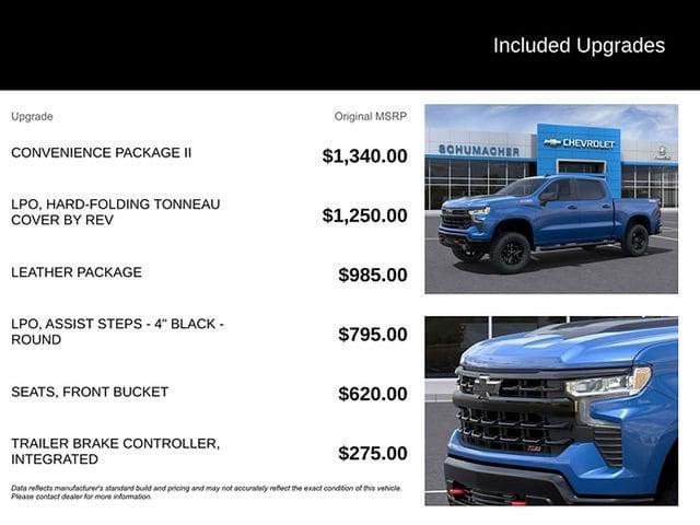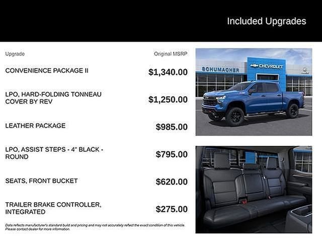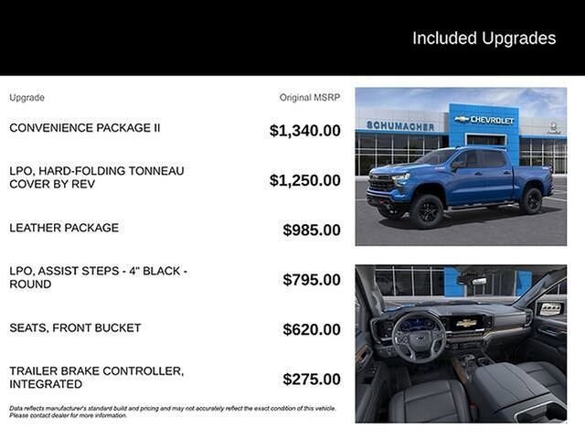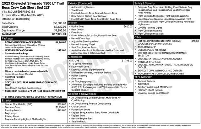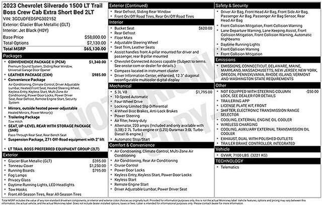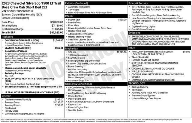 Schumacher Chevrolet of Boonton is pumped up to offer this stout 2023 Chevrolet Silverado 1500 LT Trail Boss in Glacier Blue Metallic Beautifully equipped with Convenience Package (10-Way Power Driver Seat w/Lumbar, 120-Volt Bed Mounted Power Outlet, 120-Volt Instrument Panel Power Outlet, Dual Rear USB Ports (Charge Only), Dual-Zone Automatic Climate Control, Electric Rear-Window Defogger, Heated Driver & Front Outboard Passenger Seats, Heated Steering Wheel, Keyless Open & Start, Remote Vehicle Starter System, Theft Deterrent System (Unauthorized Entry), and Wrapped Steering Wheel), Convenience Package II (Hitch Guidance w/Hitch View, Integrated Trailer Brake Controller, Power Sliding Rear Window w/Rear Defogger, Premium Bose 7-Speaker Sound System, Trailering App, and Universal Home Remote), Leather Package (Leather-Appointed Front Seat Trim), Preferred Equipment Group 2LT (12.3 Multicolor Reconfigurable Digital Display, 6-Speaker Audio System, All-Weather Floor Liner (LPO) (AAK), Auto-Locking Rear Differential, Bluetooth® For Phone, Chevrolet Connected Access Capable, Color-Keyed Carpeting Floor Covering, Compass, Deep-Tinted Glass, Electrical Steering Column Lock, Electronic Cruise Control, EZ Lift Power Lock & Release Tailgate, Front LED Fog Lamps, HD Rear Vision Camera, Heated Power-Adjustable Outside Mirrors, High Gloss Black Mirror Caps, Inside Rear-View Mirror w/Tilt, LED Cargo Area Lighting, OnStar & Chevrolet Connected Services Capable, Performance Red Recovery Hooks, Power Front Windows w/Driver Express Up/Down, Power Front Windows w/Passenger Express Down, Power Rear Windows w/Express Down, Rear 60/40 Folding Bench Seat (Folds Up), SiriusXM w/360L, Standard Tailgate, Steering Wheel Audio Controls, Wi-Fi Hot Spot Capable, and Wireless Phone Projection), Suspension Package (Heavy-Duty Air Filter and Hill Descent Control), Trailering Package (Hitch Guidance), Up-Level Rear Seat w/Storage Package, 10-Speed Automatic, 4WD, Black Leather, 170 Amp Alternator, 2 USB Data Ports, 220 Amp Alternator, 4-Wheel Disc Brakes, 4 Black Round Assist Steps (LPO), 40/20/40 Front Split-Bench Seat, 6 Speakers, ABS brakes, Air Conditioning, Alloy wheels, AM/FM radio: SiriusXM with 360L, Apple CarPlay/Android Auto, Auto High-beam Headlights, Automatic Emergency Braking, Automatic temperature control, Auxiliary External Transmission Oil Cooler, Brake assist, Cloth Seat Trim, Delay-off headlights, Driver door bin, Driver vanity mirror, Dual Exhaust w/Polished Outlets, Dual front impact airbags, Dual front side impact airbags, Electronic Stability Control, Electronic Transmission Range Selector Shifter, External Engine Oil Cooler, Floor Mounted Center Console, Following Distance Indicator, Forward Collision Alert, Front anti-roll bar, Front Bucket Seats, Front Center Armrest w/Storage, Front dual zone A/C, Front fog lights, Front License Plate Kit, Front Pedestrian Braking, Front reading lights, Front wheel independent suspension, Fully automatic headlights, Hard-Folding Tonneau Cover (LPO), Heated door mirrors, Heated front seats, Heated steering wheel, Illuminated entry, IntelliBeam Automatic High Beam On/Off, Lane Keep Assist w/Lane Departure Warning, Low tire pressure warning, Not Equipped w/Steering Column Lock, Occupant sensing airbag, Outside temperature display, Overhead airbag, Overhead console, Panic alarm, Passenger door bin, Passenger vanity mirror, Power door mirrors, Power driver seat, Power steering, Power windows, Premium audio system: Chevrolet Infotainment 3 Premium, Radio data system, Radio: Chevrolet Infotainment 3 Premium System, Rear reading lights, Rear step bumper, Rear window defroster, Remote keyless entry, Security system, Speed control, Speed-sensing steering, Split folding rear seat, Steering wheel mounted audio controls, Tachometer, Telescoping steering wheel, Tilt steering wheel, Traction control, Trip computer, Variably intermittent wipers, Voltmeter, Wheels: