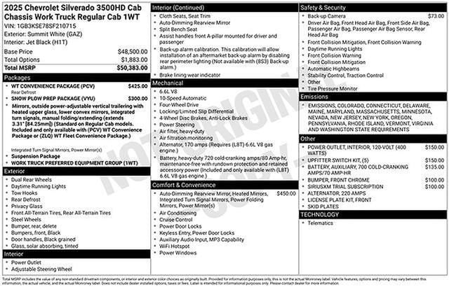 Schumacher Chevrolet of Boonton is delighted to offer this reliable 2025 Chevrolet Silverado 3500HD Work Truck in Summit White Beautifully equipped with Preferred Equipment Group 1WT (170 Amp Alternator, 2-Speed Electronic Shift Transfer Case, 3.5 Diagonal Monochromatic Display DIC, Black Front Bumper, Black Mirror Caps, Bluetooth® For Phone, Compass Located In Instrument Cluster, Manual Tilt-Wheel Steering Column, Rubberized-Vinyl Floor Covering, Solar Absorbing Tinted Glass, and Steering Wheel Mounted Electronic Cruise Control), Snow Plow Prep Package (220 Amp Alternator), Suspension Package, WT Convenience Package (Deep-Tinted Glass and Electric Rear-Window Defogger), 10-Speed Automatic, 4WD, Black Cloth, 120-Volt (400 Watts) Interior Power Outlet, 17 Painted Steel Wheels, 2 Speakers, 2-Speaker Audio System Feature, 3.73 Rear Axle Ratio, 4-Way Manual Driver Seat Adjuster, 4-Way Manual Passenger Seat Adjuster, 4-Wheel Disc Brakes, 700 Cold-Cranking Amps/70 Amp-hr Auxiliary Battery, ABS brakes, Air Conditioning, AM/FM radio, Auto High-beam Headlights, Auto-Dimming Inside Rear-View Mirror, Brake assist, Compass, Delay-off headlights, Driver door bin, Dual front impact airbags, Dual front side impact airbags, Dual rear wheels, Electronic Stability Control, Front 40/20/40 Split-Bench Seat, Front anti-roll bar, Front Center Armrest w/Storage, Front Chrome Bumper, Front Grille Bar w/Black Mesh Inserts, Front License Plate Kit, Front reading lights, Front wheel independent suspension, Fully automatic headlights, Heavy-Duty 80 Amp-Hr Battery, Illuminated entry, Low tire pressure warning, Manual Tilt Inside Rearview Mirror, Occupant sensing airbag, OnStar Services Capable, Outside temperature display, Overhead airbag, Overhead console, Panic alarm, Passenger door bin, Passenger vanity mirror, Perimeter Lighting, Power steering, Power windows, Power-Adjustable Outside Mirrors, Radio: Chevrolet Infotainment 3 System, Remote keyless entry, SiriusXM Trial Subscription, Speed control, Tachometer, Tilt steering wheel, Traction control, Trip computer, Upfitter Switch Kit (5), Variably intermittent wipers, Vinyl Seat Trim, and Voltmeter! Price includes: $1000 - Customer Cash. Exp. 01/02/2026 Price includes $14,315 in dealer added accessories.