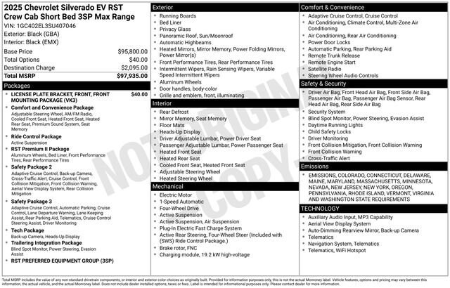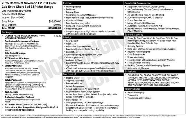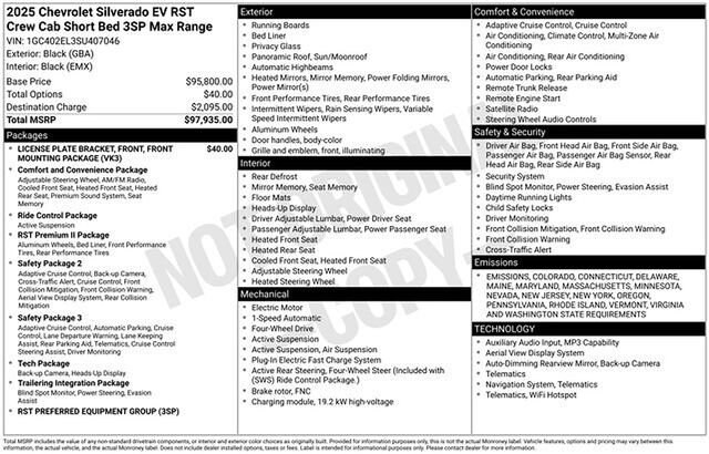 Schumacher Chevrolet of Boonton is pleased to offer this attractive 2025 Chevrolet Silverado EV RST in Black Beautifully equipped with Front License Plate Bracket Mounting Package, Preferred Equipment Group 3SP (Max Range Battery Pack), 4-Wheel Disc Brakes, 7 Speakers, ABS brakes, Adaptive suspension, Air Conditioning, Alloy wheels, AM/FM radio: SiriusXM with 360L, Auto High-beam Headlights, Auto-dimming door mirrors, Auto-dimming Rear-View mirror, Auto-leveling suspension, Automatic temperature control, Bose Premium 7-Speaker Audio System, Brake assist, Delay-off headlights, Driver door bin, Driver Memory, Driver vanity mirror, Dual front impact airbags, Dual front side impact airbags, Electronic Stability Control, Emergency communication system: OnStar, Evotex Seat Trim, Four wheel independent suspension, Front anti-roll bar, Front Bucket Seats, Front Center Armrest w/Storage, Front dual zone A/C, Front reading lights, Fully automatic headlights, Garage door transmitter, Heads-Up Display, Heated door mirrors, Heated front seats, Heated rear seats, Heated steering wheel, Low tire pressure warning, Memory seat, Navigation System, Occupant sensing airbag, Outside temperature display, Overhead airbag, Overhead console, Panic alarm, Passenger door bin, Passenger vanity mirror, Power door mirrors, Power driver seat, Power passenger seat, Power steering, Power windows, Radio data system, Radio: 17.7 Diagonal Advanced Color LCD Display, Rain sensing wipers, Rear reading lights, Rear seat center armrest, Rear step bumper, Rear window defroster, Remote keyless entry, Security system, Speed control, Speed-sensing steering, Split folding rear seat, Sport steering wheel, Steering wheel memory, Steering wheel mounted audio controls, Telescoping steering wheel, Tilt steering wheel, Traction control, Trip computer, Variably intermittent wipers, Ventilated front seats, and Wheels: 24 x 9.0 Carbon Flash Metallic Aluminum! Price includes: $250 - Purchase Allowance for Current Eligible Non-GM Owners and Lessees. Exp. 02/02/2026 $4000 - Customer Cash. Exp. 02/02/2026