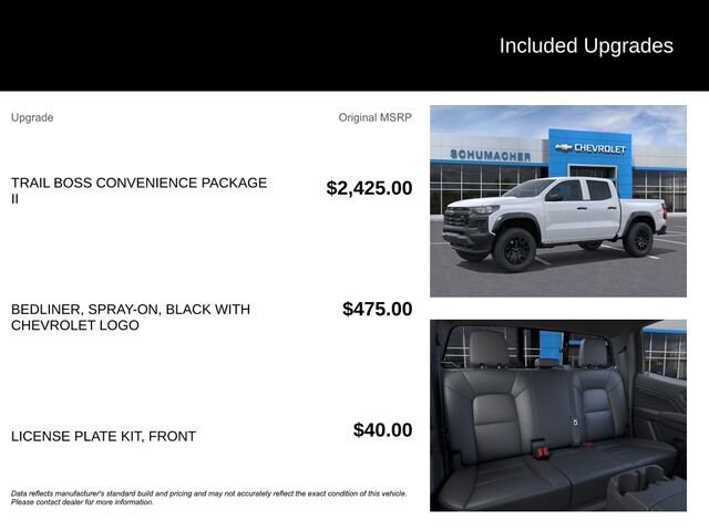 Schumacher Chevrolet of Boonton is very proud to offer this good-looking 2026 Chevrolet Colorado Trail Boss in Summit White Beautifully equipped with Preferred Equipment Group 0TR (Automatic Emergency Braking, Chevy Safety Assist, Following Distance Indicator, Forward Collision Alert, Front Pedestrian and Bicyclist Braking, IntelliBeam Automatic High Beam on/Off, and Lane Keep Assist with Lane Departure Warning), Trail Boss Convenience Package II (4-Spoke Wrapped Steering Wheel, 8-Way Power Driver Seat Adjuster, Driver and Front Passenger Heated Seats, Evotex Seat Trim, Heated Steering Wheel, Power Driver Lumbar Control Seat Adjuster, Remote Vehicle Starter System, and Wireless Phone Charging), 4WD, 3.42 Rear Axle Ratio, 4-Way Manual Passenger Seat Adjuster, 4-Wheel Disc Brakes, 6 Speakers, 6-Speaker Audio System Feature, 6-Way Manual Driver Seat Adjuster, ABS brakes, Air Conditioning, Alloy wheels, AM/FM radio: SiriusXM with 360L, Apple CarPlay/Android Auto, Auto High-beam Headlights, Automatic temperature control, Black Spray-on Bedliner with Chevrolet Logo, Brake assist, Cloth Seat Trim, Compass, Delay-off headlights, Driver door bin, Driver vanity mirror, Dual front impact airbags, Dual front side impact airbags, Electronic Stability Control, Emergency communication system: OnStar, Front anti-roll bar, Front Bucket Seats, Front Center Armrest, Front dual zone A/C, Front License Plate Kit, Front wheel independent suspension, Heated door mirrors, Illuminated entry, Low tire pressure warning, Navigation System, Occupant sensing airbag, Outside temperature display, Overhead airbag, Overhead console, Panic alarm, Passenger door bin, Passenger vanity mirror, Power door mirrors, Power steering, Power windows, Radio data system, Radio: 11.3 Diagonal Advanced Color LCD Display, Rear reading lights, Rear step bumper, Rear window defroster, Remote keyless entry, Security system, SiriusXM with 360L Trial Subscription, Speed control, Speed-sensing steering, Split folding rear seat, Steering Wheel Mounted Audio Controls, Steering wheel mounted audio controls, Tachometer, Tilt steering wheel, Traction control, Trip computer, Variably intermittent wipers, Wheels: 18 x 8.5 Black High Gloss Aluminum, and Wireless Phone Projection! Price includes: $2000 - Chevrolet Mid-Pickup Competitive Cash Allowance. Exp. 01/02/2026 $500 - Customer Cash. Exp. 01/02/2026