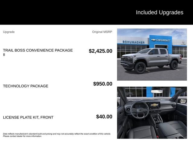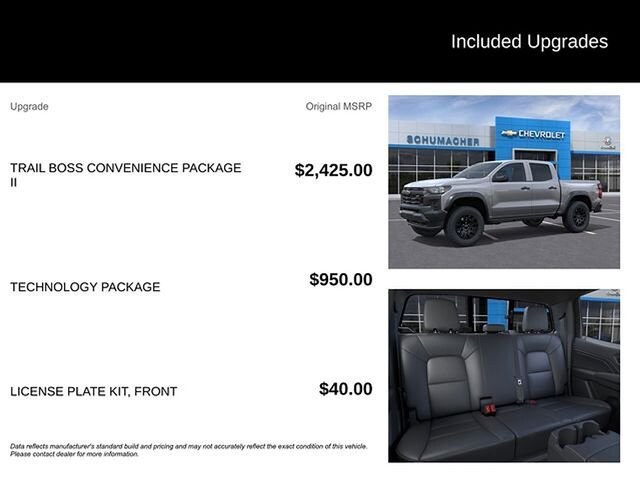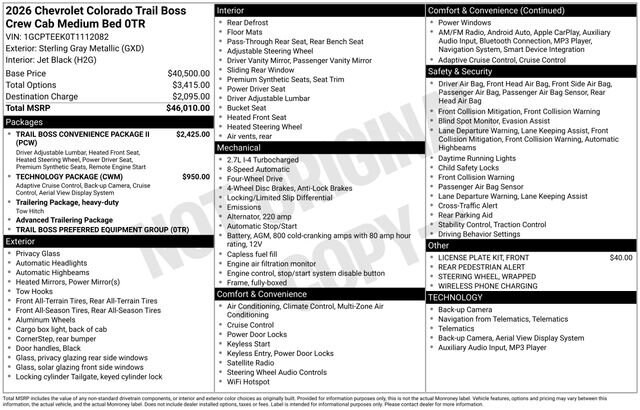 Schumacher Chevrolet of Boonton is pleased to offer this good-looking 2026 Chevrolet Colorado Trail Boss in Sterling Gray Metallic Beautifully equipped with Preferred Equipment Group 0TR (Automatic Emergency Braking, Chevy Safety Assist, Following Distance Indicator, Forward Collision Alert, Front Pedestrian and Bicyclist Braking, IntelliBeam Automatic High Beam on/Off, and Lane Keep Assist with Lane Departure Warning), Technology Package (Adaptive Cruise Control, HD Surround Vision, and Rear Pedestrian Alert), Trail Boss Convenience Package II (4-Spoke Wrapped Steering Wheel, 8-Way Power Driver Seat Adjuster, Driver and Front Passenger Heated Seats, Evotex Seat Trim, Heated Steering Wheel, Power Driver Lumbar Control Seat Adjuster, Remote Vehicle Starter System, and Wireless Phone Charging), 4WD, 3.42 Rear Axle Ratio, 4-Way Manual Passenger Seat Adjuster, 4-Wheel Disc Brakes, 6 Speakers, 6-Speaker Audio System Feature, 6-Way Manual Driver Seat Adjuster, ABS brakes, Air Conditioning, Alloy wheels, AM/FM radio: SiriusXM with 360L, Apple CarPlay/Android Auto, Auto High-beam Headlights, Automatic temperature control, Brake assist, Cloth Seat Trim, Compass, Delay-off headlights, Driver door bin, Driver vanity mirror, Dual front impact airbags, Dual front side impact airbags, Electronic Stability Control, Emergency communication system: OnStar, Front anti-roll bar, Front Bucket Seats, Front Center Armrest, Front dual zone A/C, Front License Plate Kit, Front wheel independent suspension, Heated door mirrors, Illuminated entry, Low tire pressure warning, Navigation System, Occupant sensing airbag, Outside temperature display, Overhead airbag, Overhead console, Panic alarm, Passenger door bin, Passenger vanity mirror, Power door mirrors, Power steering, Power windows, Radio data system, Radio: 11.3 Diagonal Advanced Color LCD Display, Rear reading lights, Rear step bumper, Rear window defroster, Remote keyless entry, Security system, SiriusXM with 360L Trial Subscription, Speed control, Speed-sensing steering, Split folding rear seat, Steering Wheel Mounted Audio Controls, Steering wheel mounted audio controls, Tachometer, Tilt steering wheel, Traction control, Trip computer, Variably intermittent wipers, Wheels: 18 x 8.5 Black High Gloss Aluminum, and Wireless Phone Projection! Price includes: $2000 - Chevrolet Mid-Pickup Competitive Cash Allowance. Exp. 02/02/2026 $500 - Customer Cash. Exp. 02/02/2026