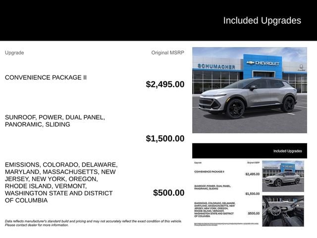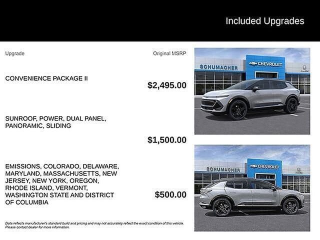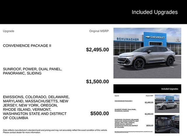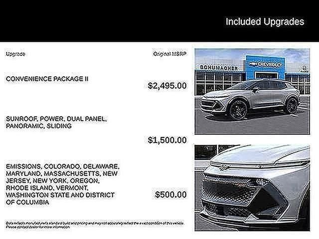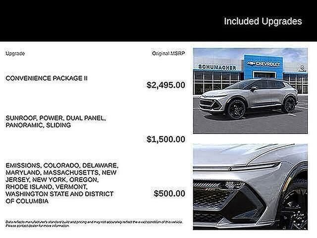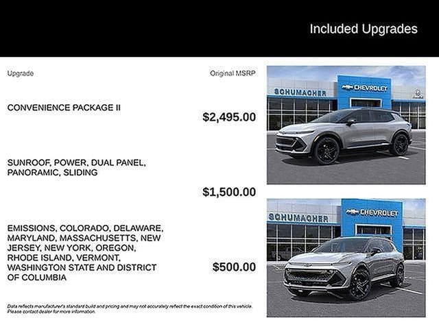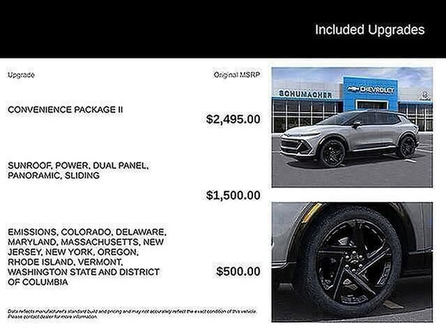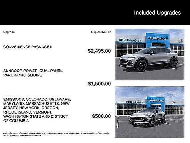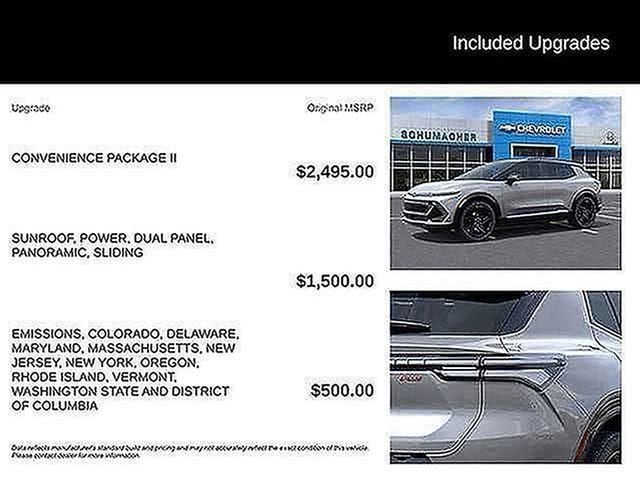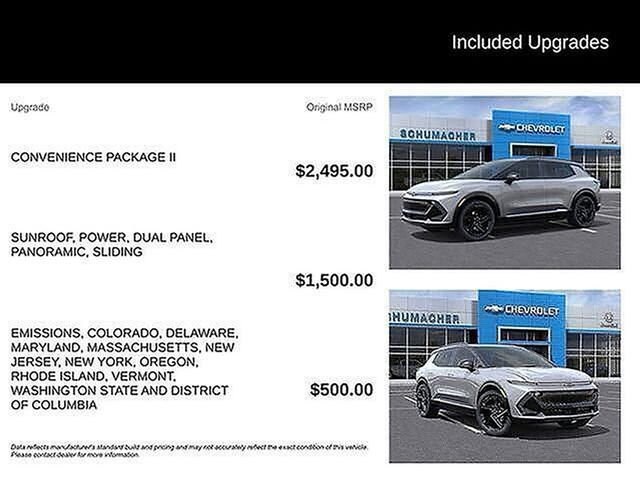 Schumacher Chevrolet of Boonton is very proud to offer this good-looking 2026 Chevrolet Equinox EV RS in Sterling Gray Metallic Beautifully equipped with Convenience Package II (2-Way Front Passenger Power Lumbar, Driver Memory, Dual-Zone Automatic Climate Control, Front Passenger 6-Way Power Seat Adjuster, Head-Up Display, Heated Rear Outboard Passenger Cushion, Heated Wiper Park, Rear Camera Mirror, Rear Camera Mirror Washer, Universal Home Remote, Uplevel Neutral Density LED Tail Lamps, and Wheels: 21 Black Painted Aluminum), Preferred Equipment Group 2RS (Auto-Dimming Inside Rear-View Mirror), 4-Wheel Disc Brakes, 6 Speakers, 6-Speaker Audio System Feature, ABS brakes, Air Conditioning, Alloy wheels, AM/FM radio: SiriusXM with 360L, Auto High-beam Headlights, Auto-dimming Rear-View mirror, Automatic temperature control, Brake assist, Bumpers: body-color, Compass, Delay-off headlights, Driver 8-Way Power Seat Adjuster, Driver door bin, Driver vanity mirror, Dual front impact airbags, Dual front side impact airbags, Electronic Stability Control, Emergency communication system: OnStar and Chevrolet connected services capable, Evotex Seat Trim, Four wheel independent suspension, Front anti-roll bar, Front Bucket Seats, Front Center Armrest, Front Passenger 4-Way Manual Seat Adjuster, Front reading lights, Fully automatic headlights, Heated door mirrors, Heated front seats, Heated steering wheel, Illuminated entry, Knee airbag, Low tire pressure warning, Navigation system: Google built-in compatibility (select service plan required, terms and limitations apply), Occupant sensing airbag, Outside temperature display, Overhead airbag, Overhead console, Panic alarm, Passenger door bin, Passenger vanity mirror, Power door mirrors, Power Driver Lumbar Control, Power driver seat, Power Dual Panel Panoramic Sliding Sunroof, Power Liftgate, Power steering, Power windows, Radio: 17.7 Diagonal Advanced Color LCD Display, Rear anti-roll bar, Rear reading lights, Rear seat center armrest, Rear window defroster, Rear window wiper, Remote keyless entry, Security system, Speed control, Split folding rear seat, Spoiler, Sport steering wheel, Steering wheel mounted audio controls, Telescoping steering wheel, Tilt steering wheel, Traction control, Trip computer, Turn signal indicator mirrors, and Variably intermittent wipers!