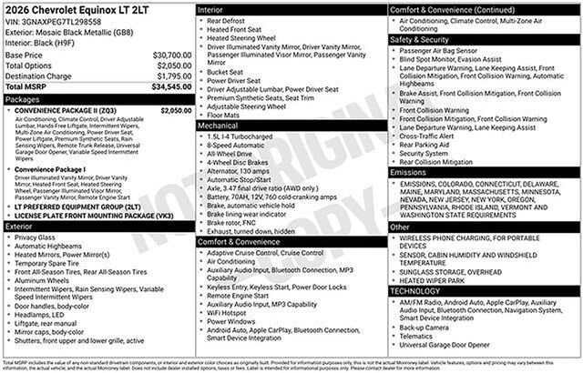 Schumacher Chevrolet of Boonton is honored to offer this charming 2026 Chevrolet Equinox LT in Mosaic Black Metallic Beautifully equipped with Convenience Package II (2-Way Power Driver Lumbar Control Seat Adjuster, AutoSense Hands-Free Power Programmable Liftgate, Cabin Humidity & Windshield Sensor, Driver 8-Way Power Seat Adjuster, Dual-Zone Automatic Climate Control, Evotex Seat Trim, Heated Wiper Park, Intermittent Front Rain-Sensing Wipers, Overhead Sunglass Storage, Programmable Universal Home Remote, and Wireless Phone Charging for Portable Devices), Preferred Equipment Group 2LT, AWD, 3.47 Final Drive Axle Ratio, 4-Wheel Disc Brakes, 6 Speakers, ABS brakes, Air Conditioning, Alloy wheels, AM/FM radio: SiriusXM, Auto High-beam Headlights, Brake assist, Bumpers: body-color, Cloth Seat Trim, Compass, Delay-off headlights, Driver 6-Way Manual Seat Adjuster, Driver door bin, Driver vanity mirror, Dual front impact airbags, Dual front side impact airbags, Electronic Stability Control, Emergency communication system: OnStar and Chevrolet connected services capable, Four wheel independent suspension, Front anti-roll bar, Front Bucket Seats, Front Center Armrest, Front Passenger 4-Way Manual Seat Adjuster, Front reading lights, Fully automatic headlights, Heated door mirrors, Heated Driver & Front Passenger Seats, Heated front seats, Heated steering wheel, Illuminated entry, Low tire pressure warning, Navigation System, Occupant sensing airbag, Outside temperature display, Overhead airbag, Overhead console, Panic alarm, Passenger door bin, Passenger vanity mirror, Power door mirrors, Power steering, Power windows, Premium audio system: Chevrolet Infotainment 3, Radio data system, Radio: 11.3 Diagonal Advanced Color LCD Display, Rear anti-roll bar, Rear reading lights, Rear seat center armrest, Rear window defroster, Rear window wiper, Remote keyless entry, Security system, SiriusXM w/360L Trial Subscription, Speed control, Speed-sensing steering, Split folding rear seat, Spoiler, Steering wheel mounted audio controls, Tachometer, Telescoping steering wheel, Tilt steering wheel, Traction control, Trip computer, Variably intermittent wipers, and Wheels: 17 Grazen Metallic Machined-Face Aluminum!