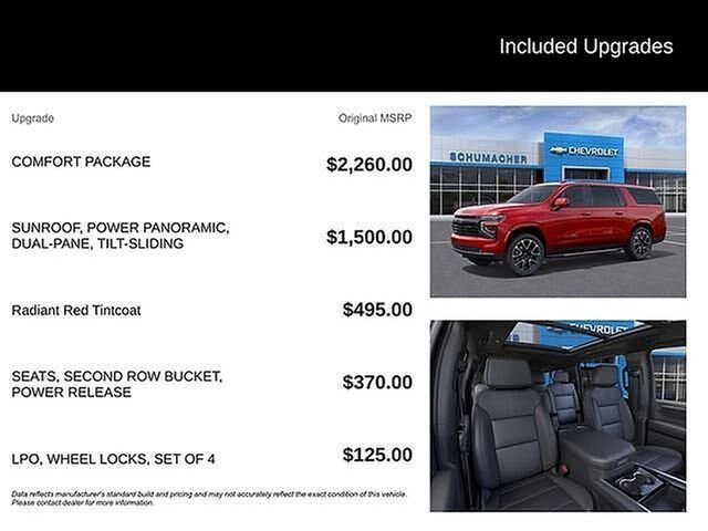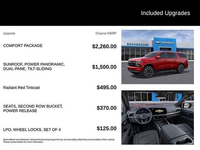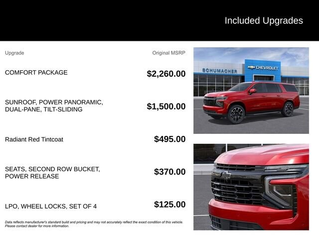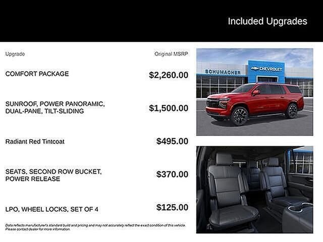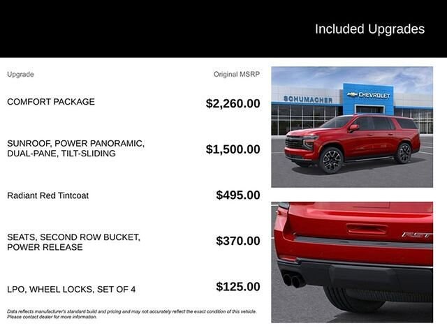 Schumacher Chevrolet of Boonton is pumped up to offer this stunning 2026 Chevrolet Suburban RST in Radiant Red Tintcoat Beautifully equipped with Comfort Package (2nd Row Power Release 60/40 Split-Folding Bench Seat, 3rd Row 60/40 Power-Folding Split-Bench, Bose 10-Speaker Surround with CenterPoint, Heated 2nd Row Outboard Seats, Heated Power-Adjustable Outside Mirrors, Heated Steering Wheel, LED Headlamps with LED Daytime Running Lamps, LED Tail Lamps, and Memory Settings), License Plate Front Mounting Package, Preferred Equipment Group 1SP (8-Way Power Front Passenger Seat Adjuster, Auto-Dimming Inside Rear-View Mirror, Bright Front and Rear Door Sill Plates, Dual Exhaust System, Front LED Fog Lamps, Heated Driver and Front Passenger Seats, Interior Camera, Memory Settings For Driver, Rear Power Liftgate, RST Exterior Features, Universal Home Remote, Wheel Locks (set of 4), Wheels: 22 x 9 Bright Machined, and Wireless Phone Charging), 2-Way Driver Power Lumbar Seat Adjuster, 2-Way Front Passenger Power Lumbar Seat Adjuster, 3.23 Rear Axle Ratio, 3rd row seats: split-bench, 4-Wheel Disc Brakes, 6 Speakers, 6-Speaker Audio System, 8-Way Power Driver Seat Adjuster, ABS brakes, Air Conditioning, Alloy wheels, AM/FM radio: SiriusXM with 360L, Apple CarPlay/Android Auto, Auto High-beam Headlights, Auto-dimming Rear-View mirror, Automatic temperature control, Brake assist, Bumpers: body-color, Compass, Delay-off headlights, Deleted Mobile Service Plus, Driver door bin, Driver vanity mirror, Dual front impact airbags, Dual front side impact airbags, Dual-Pane Power Panoramic Sunroof, Electronic Stability Control, Emergency communication system: OnStar Services capable, Exterior Parking Camera Rear, Four wheel independent suspension, Front anti-roll bar, Front Bucket Seats, Front Center Armrest, Front dual zone A/C, Front fog lights, Front reading lights, Fully automatic headlights, Garage door transmitter, Heated door mirrors, Heated front seats, Illuminated entry, Low tire pressure warning, Memory seat, Navigation system: Google built-in compatibility (select service plan required, terms and limitations apply), Occupant sensing airbag, Outside temperature display, Overhead airbag, Overhead console, Panic alarm, Passenger door bin, Passenger vanity mirror, Perforated Leather Seating Surfaces, Power door mirrors, Power driver seat, Power Liftgate, Power passenger seat, Power Release 2nd Row Bucket Seats, Power steering, Power windows, Premium Smooth Ride Suspension, Radio data system, Radio: 17.7 Diagonal Advanced Color LCD Display, Rain sensing wipers, Rear air conditioning, Rear anti-roll bar, Rear reading lights, Rear seat center armrest, Rear window defroster, Rear window wiper, Remote keyless entry, Security system, SiriusXM with 360L Trial Subscription, Speed control, Speed-sensing steering, Split folding rear seat, Spoiler, Steering wheel mounted audio controls, Tachometer, Telescoping steering wheel, Tilt steering wheel, Traction control, Trip computer, Variably intermittent wipers, Voltmeter, and Wireless Apple CarPlay/Wireless Android Auto!