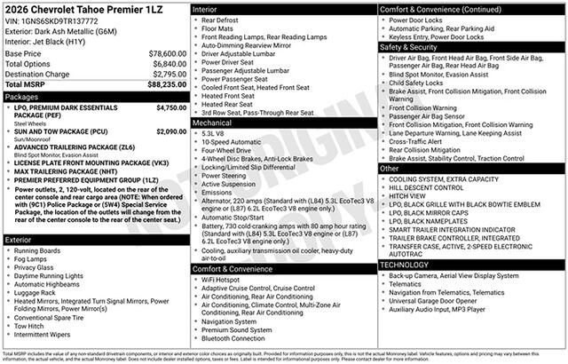 Schumacher Chevrolet of Boonton is honored to offer this outstanding 2026 Chevrolet Tahoe Premier in Dark Ash Metallic Beautifully equipped with Advanced Trailering Package (Blind Zone Steering Assist with Trailering, Hitch View with Pan/Zoom Image Adjustment, and Smart Trailer Integration Indicator), License Plate Front Mounting Package, Max Trailering Package (2-Speed Active Electronic AutoTrac Transfer Case, Hill Descent Control, and Integrated Trailer Brake Controller), Preferred Equipment Group 1LZ (1st and 2nd Row Color-Keyed Carpeted Floor Mats, 20 x 9 Polished Aluminum Wheels, 3-Spoke Wrapped Steering Wheel, 3rd Row 60/40 Power-Folding Split-Bench Seat, Auto-Dimming Inside Rear-View Mirror, Bose 10-Speaker Centerpoint Surround Audio System Feature, Bright Front and Rear Door Sill Plates, Chrome Door Handles with Body-Color Strip, Chrome Mirror Caps, Color-Keyed Carpeting Floor Covering, Dual Exhaust System, Floor Console, Front Bucket Seats, Front LED Fog Lamps, Frontal Driver and Outboard Passenger Airbags, Heated 2nd Row Outboard Seats, Heated Steering Wheel, Interior Camera, Key Card, LED Headlamps with LED Daytime Running Lamps, LED Tail Lamps, Magnetic Ride Control Suspension, Memory Settings, Outside Heated Power-Adjustable Mirrors, Power Release 2nd Row Bucket Seats, Power Tilt and Telescopic Steering Column, Rear Power Liftgate, Remote Start, SiriusXM with 360L Trial Subscription, Universal Home Remote, and Wireless Phone Charging), Premium Dark Essentials Package (Black Grille with Black Bowtie Emblem, Black Name Plates, and Wheels: 22 x 9 Steel Interim), Sun and Tow Package (Dual-Pane Power Panoramic Sunroof), 4WD, Black Leather, 10 Speakers, 3.23 Rear Axle Ratio, 3rd row seats: split-bench, 4-Way Power Driver Lumbar Seat Adjuster, 4-Way Power Front Passenger Lumbar Seat Adjuster, 4-Wheel Disc Brakes, 8-Way Power Driver Seat Adjuster, 8-Way Power Front Passenger Seat Adjuster, ABS brakes, Adaptive suspension, Air Conditioning, Alloy wheels, AM/FM radio: SiriusXM with 360L, Apple CarPlay/Android Auto, Auto High-beam Headlights, Auto-dimming door mirrors, Auto-dimming Rear-View mirror, Auto-leveling suspension, Automatic temperature control, Black Mirror Caps, Brake assist, Bumpers: body-color, Compass, Delay-off headlights, Driver and Front Passenger Heated and Ventilated Seats, Driver door bin, Driver vanity mirror, Dual front impact airbags, Dual front side impact airbags, Electronic Stability Control, Emergency communication system: OnStar and Chevrolet connected services capable, Exterior Parking Camera Rear, Extra Capacity Cooling System, Four wheel independent suspension, Front anti-roll bar, Front Center Armrest, Front dual zone A/C, Front fog lights, Front reading lights, Fully automatic headlights, Garage door transmitter, Heated door mirrors, Heated Driver and Front Passenger Seats, Heated front seats, Heated rear seats, Heated steering wheel, Illuminated entry, Low tire pressure warning, Memory seat, Navigation system: Google built-in compatibility (select service plan required, terms and limitations apply), Occupant sensing airbag, Outside temperature display, Overhead airbag, Overhead console, Panic alarm, Passenger door bin, Passenger vanity mirror, Perforated Leather Seat Trim, Power door mirrors, Power driver seat, Power Liftgate, Power passenger seat, Power steering, Power windows, Premium audio system: Chevrolet Infotainment 3 Premium, Radio data system, Radio: 17.7 Diagonal Advanced Color LCD Display, Rain sensing wipers, Rear air conditioning, Rear anti-roll bar, Rear reading lights, Rear window defroster, Rear window wiper, Remote keyless entry, Security system, Speed control, Speed-sensing steering, Split folding rear seat, Spoiler, Steering wheel memory, Steering wheel mounted audio controls, Tachometer, Telescoping steering wheel, Tilt steering wheel, Traction control, Trip computer, Turn signal indicator mirrors, Variably intermittent wipers, Ventilated front seats, and Voltme