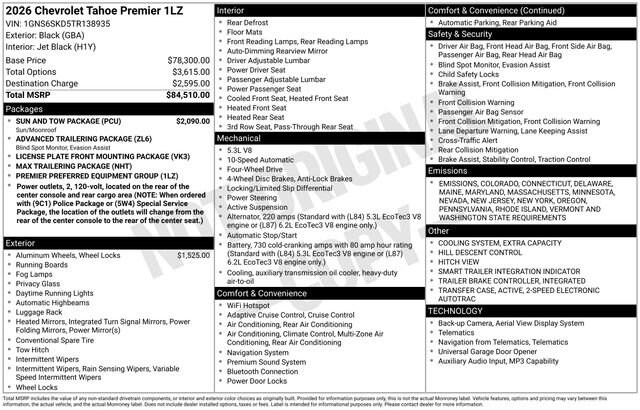 Schumacher Chevrolet of Boonton is proud to offer this superb-looking 2026 Chevrolet Tahoe Premier in Black Beautifully equipped with Advanced Trailering Package (Blind Zone Steering Assist with Trailering, Hitch View with Pan/Zoom Image Adjustment, and Smart Trailer Integration Indicator), License Plate Front Mounting Package, Max Trailering Package (2-Speed Active Electronic AutoTrac Transfer Case, Hill Descent Control, and Integrated Trailer Brake Controller), Preferred Equipment Group 1LZ (1st and 2nd Row Color-Keyed Carpeted Floor Mats, 20 x 9 Polished Aluminum Wheels, 3-Spoke Wrapped Steering Wheel, 3rd Row 60/40 Power-Folding Split-Bench Seat, Auto-Dimming Inside Rear-View Mirror, Bose 10-Speaker Centerpoint Surround Audio System Feature, Bright Front and Rear Door Sill Plates, Chrome Door Handles with Body-Color Strip, Chrome Mirror Caps, Color-Keyed Carpeting Floor Covering, Dual Exhaust System, Floor Console, Front Bucket Seats, Front LED Fog Lamps, Frontal Driver and Outboard Passenger Airbags, Heated 2nd Row Outboard Seats, Heated Steering Wheel, Interior Camera, Key Card, LED Headlamps with LED Daytime Running Lamps, LED Tail Lamps, Magnetic Ride Control Suspension, Memory Settings, Outside Heated Power-Adjustable Mirrors, Power Release 2nd Row Bucket Seats, Power Tilt and Telescopic Steering Column, Rear Power Liftgate, Remote Start, SiriusXM with 360L Trial Subscription, Universal Home Remote, and Wireless Phone Charging), Sun and Tow Package (Dual-Pane Power Panoramic Sunroof), 4WD, Jet Black Leather, 10 Speakers, 3.23 Rear Axle Ratio, 3rd row seats: split-bench, 4-Way Power Driver Lumbar Seat Adjuster, 4-Way Power Front Passenger Lumbar Seat Adjuster, 4-Wheel Disc Brakes, 8-Way Power Driver Seat Adjuster, 8-Way Power Front Passenger Seat Adjuster, ABS brakes, Adaptive suspension, Air Conditioning, Alloy wheels, AM/FM radio: SiriusXM with 360L, Apple CarPlay/Android Auto, Auto High-beam Headlights, Auto-dimming door mirrors, Auto-dimming Rear-View mirror, Auto-leveling suspension, Automatic temperature control, Brake assist, Bumpers: body-color, Compass, Delay-off headlights, Driver and Front Passenger Heated and Ventilated Seats, Driver door bin, Driver vanity mirror, Dual front impact airbags, Dual front side impact airbags, Electronic Stability Control, Emergency communication system: OnStar and Chevrolet connected services capable, Exterior Parking Camera Rear, Extra Capacity Cooling System, Four wheel independent suspension, Front anti-roll bar, Front Center Armrest, Front dual zone A/C, Front fog lights, Front reading lights, Fully automatic headlights, Garage door transmitter, Heated door mirrors, Heated Driver and Front Passenger Seats, Heated front seats, Heated rear seats, Heated steering wheel, Illuminated entry, Low tire pressure warning, Memory seat, Navigation system: Google built-in compatibility (select service plan required, terms and limitations apply), Occupant sensing airbag, Outside temperature display, Overhead airbag, Overhead console, Panic alarm, Passenger door bin, Passenger vanity mirror, Perforated Leather Seat Trim, Power door mirrors, Power driver seat, Power Liftgate, Power passenger seat, Power steering, Power windows, Premium audio system: Chevrolet Infotainment 3 Premium, Radio data system, Radio: 17.7 Diagonal Advanced Color LCD Display, Rain sensing wipers, Rear air conditioning, Rear anti-roll bar, Rear reading lights, Rear window defroster, Rear window wiper, Remote keyless entry, Security system, Set of 4 Wheel Locks, Speed control, Speed-sensing steering, Split folding rear seat, Spoiler, Steering wheel memory, Steering wheel mounted audio controls, Tachometer, Telescoping steering wheel, Tilt steering wheel, Traction control, Trip computer, Turn signal indicator mirrors, Variably intermittent wipers, Ventilated front seats, Voltmeter, and Wheels: 22 x 9 Manoogian Silver Painted Aluminum!