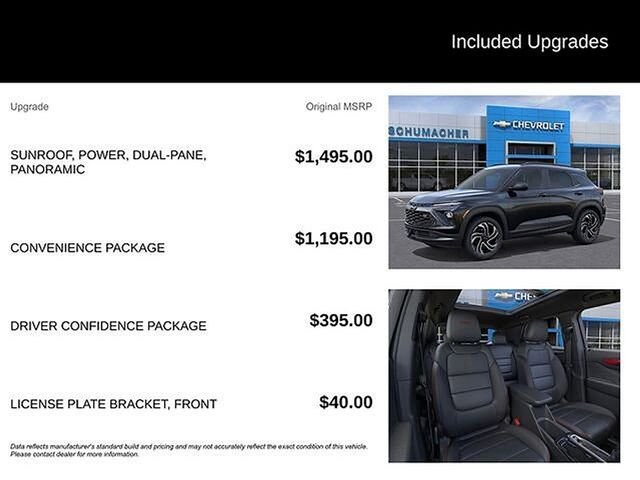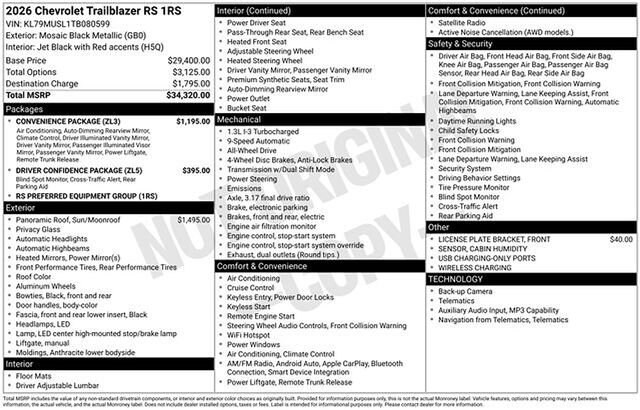 Schumacher Chevrolet of Boonton is pumped up to offer this good-looking 2026 Chevrolet TrailBlazer RS in Mosaic Black Metallic Beautifully equipped with Convenience Package (1 Type-An and 1 Type-C USB Charging-Only Ports, 120-Volt Power Outlet, Cabin Humidity Sensor, Driver and Front Passenger Illuminated Vanity Mirrors, Hands Free Power Programmable Liftgate, Inside Rear-View Auto-Dimming Mirror, Single-Zone Automatic Climate Control, and Wireless Charging), Driver Confidence Package (Lane Change Alert with Side Blind Zone Alert, Rear Cross Traffic Alert, and Rear Park Assist), Preferred Equipment Group 1RS, 1 Type-An and 1 Type-C USB Ports, 2-Way Power Driver Lumbar Seat Adjuster, 3.17 Final Drive Axle Ratio, 4-Way Manual Front Passenger Seat Adjuster, 4-Wheel Disc Brakes, 6 Speakers, 6-Speaker Audio System Feature with Amplifier, 8-Way Power Driver Seat Adjuster, ABS brakes, Air Conditioning, Alloy wheels, AM/FM radio: SiriusXM, Auto High-beam Headlights, Brake assist, Bumpers: body-color, Compass, Delay-off headlights, Driver door bin, Driver vanity mirror, Dual front impact airbags, Dual front side impact airbags, Dual-Pane Panoramic Power Sunroof, Electronic Stability Control, Emergency communication system: OnStar and Chevrolet connected services capable, Evotex Seat Trim, Exterior Parking Camera Rear, Flat-Folding Front Passenger Seatback, Front anti-roll bar, Front Bucket Seats, Front Center Armrest, Front License Plate Bracket, Front reading lights, Front wheel independent suspension, Fully automatic headlights, Heated door mirrors, Heated Driver and Front Passenger Seats, Heated front seats, Heated steering wheel, Illuminated entry, Knee airbag, Low tire pressure warning, Mosaic Black Metallic Roof, Occupant sensing airbag, Overhead airbag, Overhead console, Panic alarm, Passenger door bin, Passenger vanity mirror, Power door mirrors, Power driver seat, Power steering, Power windows, Radio data system, Radio: AM/FM Stereo Audio System, Rear seat center armrest, Rear side impact airbag, Rear window defroster, Rear window wiper, Remote keyless entry, Ride and Handling Suspension, Security system, SiriusXM Trial Subscription, Speed control, Split folding rear seat, Spoiler, Steering wheel mounted audio controls, Tachometer, Telescoping steering wheel, Tilt steering wheel, Traction control, Trip computer, Variably intermittent wipers, Wheels: 19 High Gloss Black Machined Aluminum, and Wireless Apple CarPlay/Android Auto!