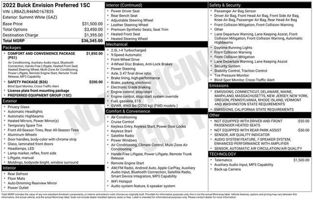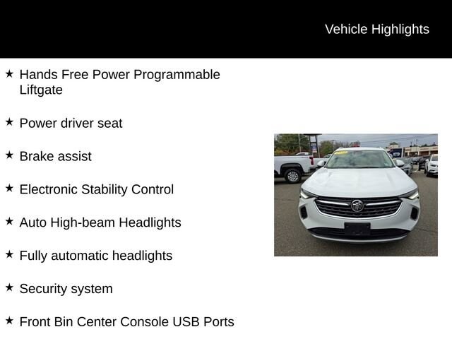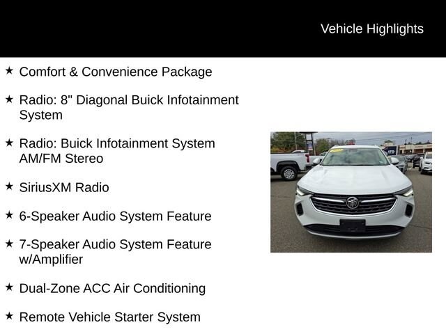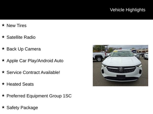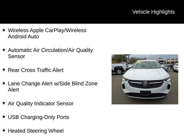 Priced below KBB Fair Purchase Price! Odometer is 3001 miles below market average!New Tires, Satellite Radio, Back Up Camera, Apple Car Play/Android Auto, Service Contract Available!, Heated Seats, 6-Speaker Audio System Feature, 7-Speaker Audio System Feature w/Amplifier, Air Quality Indicator Sensor, Alloy wheels, Auto High-beam Headlights, Automatic Air Circulation/Air Quality Sensor, Brake assist, Comfort & Convenience Package, Dual-Zone ACC Air Conditioning, Electronic Stability Control, Front Bin Center Console USB Ports, Fully automatic headlights, Hands Free Power Programmable Liftgate, Heated Driver & Front Passenger Seats, Heated Steering Wheel, Lane Change Alert w/Side Blind Zone Alert, Power driver seat, Preferred Equipment Group 1SC, Radio: 8 Diagonal Buick Infotainment System, Radio: Buick Infotainment System AM/FM Stereo, Rear Cross Traffic Alert, Remote Vehicle Starter System, Safety Package, Security system, SiriusXM Radio, USB Charging-Only Ports, Wireless Apple CarPlay/Wireless Android Auto.Summit White 2022 Buick Envision Preferred 4D Sport Utility FWD 9-Speed Automatic 2.0L Turbocharged 24/31 City/Highway MPG
