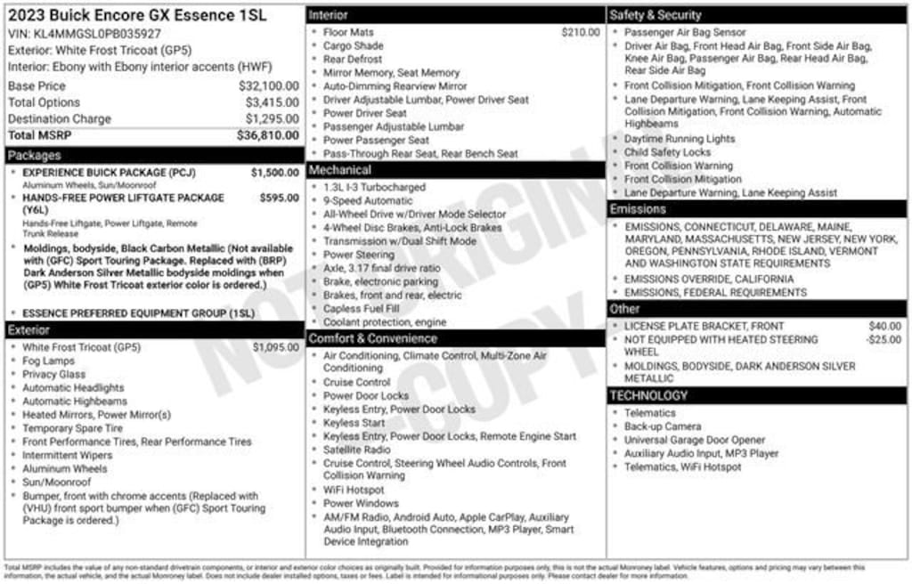 Bluetooth, Sunroof Moonroof, Satellite Radio, Leather Seats, Blind Spot Monitor, Cross Traffic Alert, Apple Car Play/Android Auto, Service Contract Available!, Heated Seats, 2 USB Ports w/Auxiliary Input Jack, 4-Wheel Disc Brakes, 8-Way Power Driver Seat Adjuster, ABS brakes, Auto High-beam Headlights, Enhanced Performance 6-Speaker System, Experience Buick Package, Fully automatic headlights, Hands Free Power Liftgate, Hands-Free Power Liftgate Package, Heated Driver & Front Passenger Seats, Heated Steering Wheel, Heated steering wheel, Memory seat, Power driver seat, Power Tilt-Sliding Moonroof, Preferred Equipment Group 1SL, Radio: 8 Diagonal Buick Infotainment System, Ride & Handling Suspension, SiriusXM Radio, Speed control, Wireless Apple CarPlay/Wireless Android Auto.White Frost Tricoat 2023 Buick Encore GX Essence 4D Sport Utility AWD 9-Speed Automatic ECOTEC 1.3L Turbo 26/29 City/Highway MPG