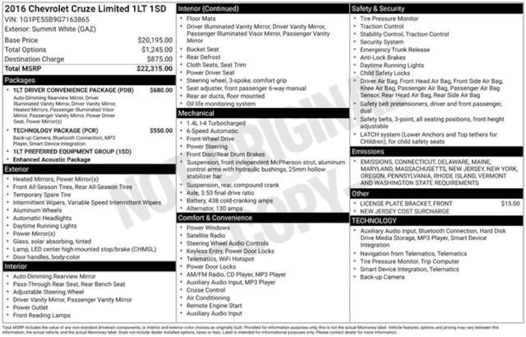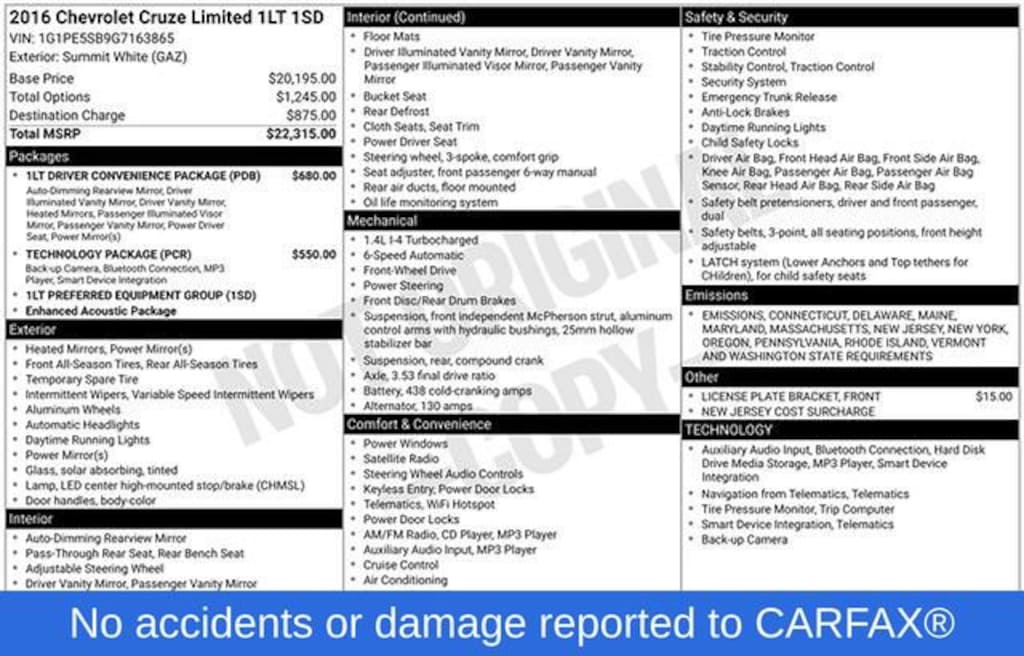 Summit White 2016 Chevrolet Cruze Limited 1LT 4D Sedan FWD 6-Speed Automatic Electronic with Overdrive ECOTEC 1.4L I4 SMPI DOHC Turbocharged VVT 26/38 City/Highway MPG