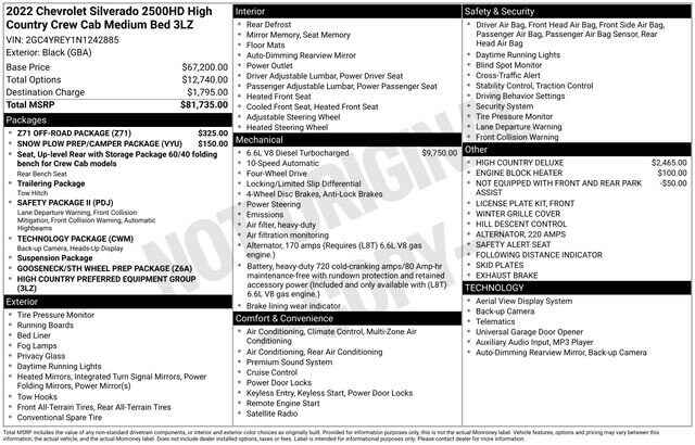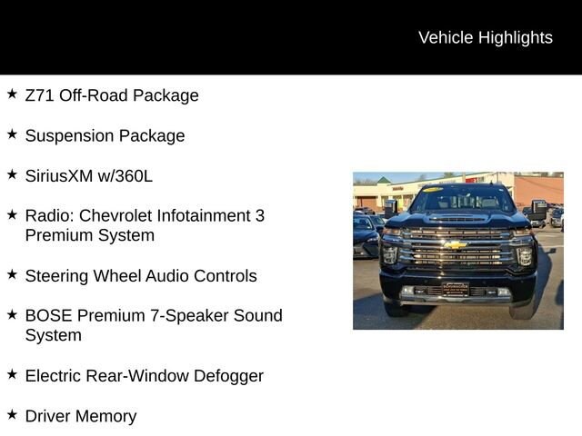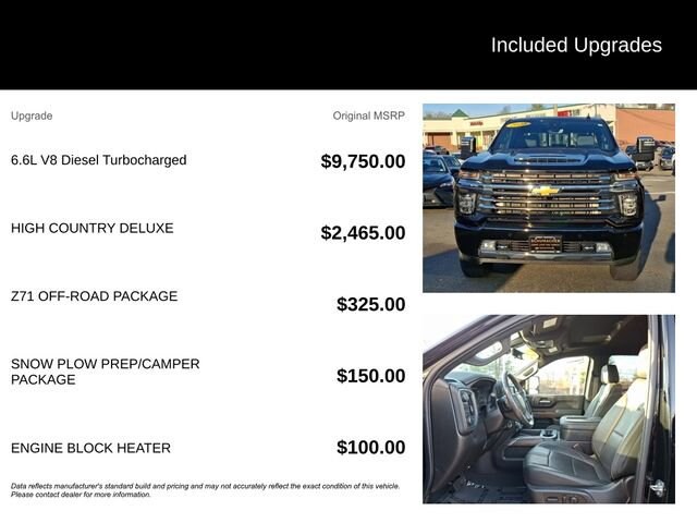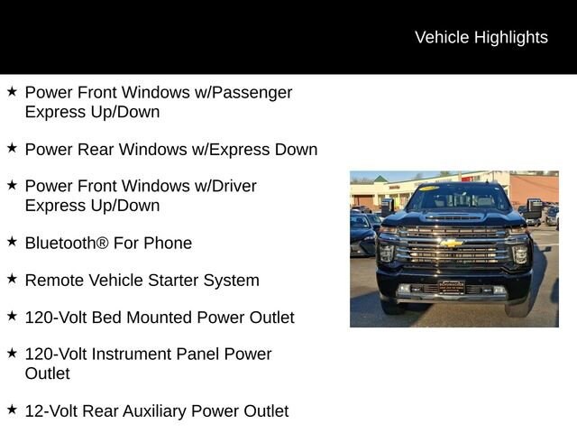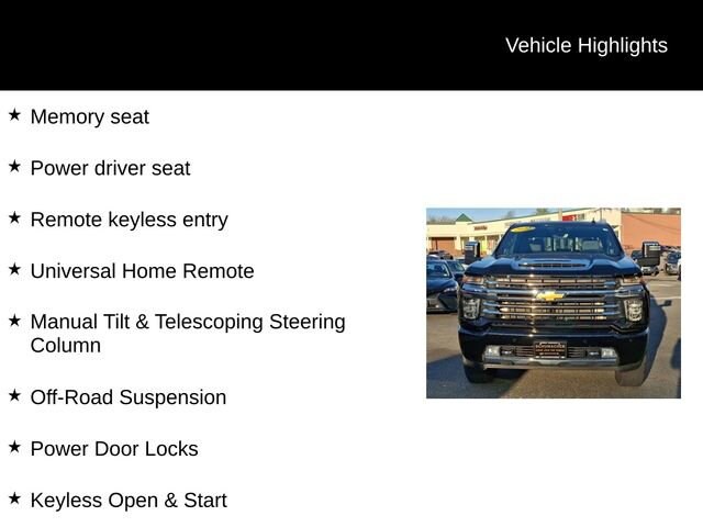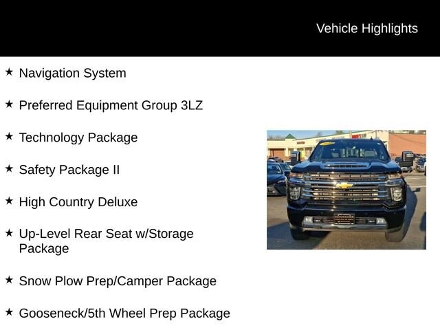 Experience the ultimate in power, capability, and luxury with the 2022 Chevrolet Silverado 2500HD High Country. This exceptional full-size truck is engineered to conquer any challenge, whether you're tackling tough job sites, navigating rugged terrain, or enjoying a comfortable ride on the highway.- Duramax 6.6L V8 Turbodiesel engine delivering an impressive 445 horsepower and 910 lb-ft of torque- High Country Deluxe package with advanced safety, technology, and convenience features- Z71 Off-Road Package for enhanced off-road performance- Snow Plow Prep/Camper Package for versatile outdoor adventuresThe Silverado 2500HD High Country is more than just a workhorse; it's a premium, feature-rich vehicle that elevates every drive. Indulge in the comfort of perforated leather-appointed seating, heated and ventilated front seats, and a heated steering wheel. Stay connected with the Chevrolet Infotainment 3 Premium System, featuring a large 8-inch touchscreen, navigation, and wireless Apple CarPlay and Android Auto compatibility.This Silverado 2500HD High Country also boasts a host of advanced safety technologies, including Automatic Emergency Braking, Forward Collision Alert, Lane Departure Warning, and Rear Cross Traffic Alert, ensuring you and your passengers can travel with confidence.Whether you're towing a heavy trailer, navigating off-road trails, or simply commuting in comfort, the 2022 Chevrolet Silverado 2500HD High Country is the ultimate expression of power, capability, and refined luxury. Experience it for yourself and discover why this exceptional truck should be your next vehicle.We invite you to visit our showroom and take this Silverado 2500HD High Country for a test drive. Our knowledgeable sales team is here to answer any questions you may have and help you find the perfect vehicle to meet your needs. We're confident that once you experience the exceptional performance, advanced features, and premium comfort of this Silverado, you won't want to settle for anything less.