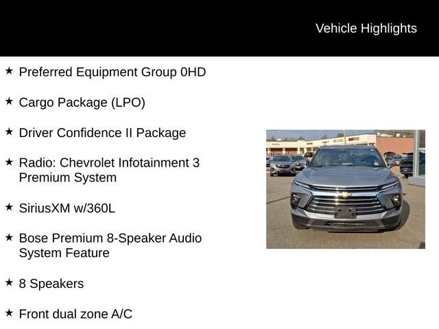 Step inside and be captivated by the premium Bose audio system, the intuitive Chevrolet Infotainment 3 Premium System, and the convenience of SiriusXM with 360L. Enjoy the comfort of heated front seats, the versatility of the power liftgate, and the added safety of features like Adaptive Cruise Control, Enhanced Automatic Emergency Braking, and the Rear Camera Mirror.