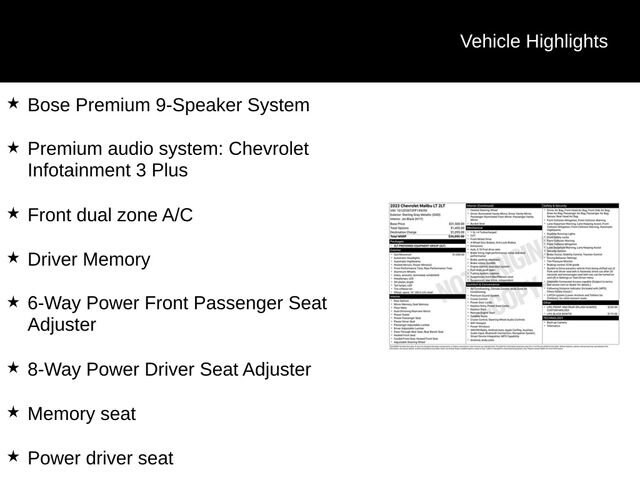 Indulge in the Malibu's premium Bose audio system, complete with SiriusXM Radio, and stay connected with the Chevrolet Infotainment 3 Plus system featuring wireless Apple CarPlay and Android Auto integration.