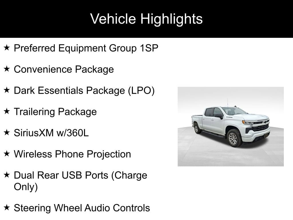 Silverado 1500 RST, 4D Crew Cab, EcoTec3 5.3L V8, 10-Speed Automatic, 4WD, Summit White, Black Cloth, 10-Way Power Driver Seat w/Lumbar, 12.3 Multicolor Reconfigurable Digital Display, 120-Volt Instrument Panel Power Outlet, 4 Black Round Assist Steps (LPO), 6-Speaker Audio System, All-Star Edition, Auto-Locking Rear Differential, Black Name Plates (LPO), Bluetooth® For Phone, Color-Keyed Carpeting Floor Covering, Compass, Convenience Package, Dark Essentials Package (LPO), Deep-Tinted Glass, Dual Rear USB Ports (Charge Only), Dual-Zone Automatic Climate Control, Electric Rear-Window Defogger, Electrical Steering Column Lock, Electronic Cruise Control, EZ Lift Power Lock & Release Tailgate, Front fog lights, Front Frame-Mounted Black Recovery Hooks, Front LED Fog Lamps, Front Rubberized Vinyl Floor Mats, Fully automatic headlights, HD Rear Vision Camera, Heated Driver & Front Outboard Passenger Seats, Heated Power-Adjustable Outside Mirrors, Heated Steering Wheel, High Gloss Black Mirror Caps, Hitch Guidance, Inside Rear-View Mirror w/Tilt, Keyless Open & Start, Lane Keep Assist w/Lane Departure Warning, LED Cargo Area Lighting, OnStar & Chevrolet Connected Services Capable, Power Front Windows w/Driver Express Up/Down, Power Front Windows w/Passenger Express Down, Power Rear Windows w/Express Down, Preferred Equipment Group 1SP, Rear 60/40 Folding Bench Seat (Folds Up), Rear Rubberized-Vinyl Floor Mats, Remote Vehicle Starter System, SiriusXM w/360L, Standard Tailgate, Steering Wheel Audio Controls, Theft Deterrent System (Unauthorized Entry), Trailering Package, Wireless Charging, Wireless Phone Projection, Wrapped Steering Wheel.
