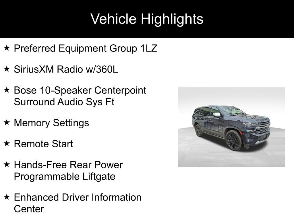 Tahoe Premier, EcoTec3 5.3L V8, 10-Speed Automatic with Overdrive, 4WD, Dark Ash Metallic, Jet Black Leather, 1st & 2nd Row Color-Keyed Carpeted Floor Mats, 2-Speed Active Electronic AutoTrac Transfer Case, 3rd Row 60/40 Power-Folding Split-Bench Seat, Auto-Dimming Inside Rear-View Mirror, Bose 10-Speaker Centerpoint Surround Audio Sys Ft, Bright Front & Rear Door Sill Plates, Chrome Door Handles w/Body-Color Strip, Chrome Mirror Caps, Color-Keyed Carpeting Floor Covering, Driver & Front Outboard Passenger Airbags, Dual Exhaust System, Dual-Pane Power Panoramic Sunroof, Enhanced Driver Information Center, Floor Console, Fully automatic headlights, Hands-Free Rear Power Programmable Liftgate, Heated & Ventilated Driver & Front Passenger Seats, Heated 2nd Row Outboard Seats, Heated door mirrors, Heated Driver & Front Passenger Seats, Heated Steering Wheel, Hill Descent Control, Infotainment Display, Lane Change Alert w/Side Blind Zone Alert, LED Daytime Running Lamps, Memory Settings, Outside Heated Power-Adjustable Mirrors, Perforated Leather Seat Trim, Power Liftgate, Power Release 2nd Row Bucket Seats, Power Tilt & Telescopic Steering Column, Preferred Equipment Group 1LZ, Rear Cross Traffic Alert, Remote Start, Safety Alert Seat, SiriusXM Radio w/360L, Universal Home Remote, Wireless Charging, Wrapped Steering Wheel.