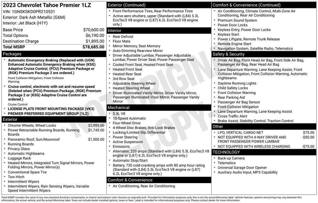 4WD, Jet Black Leather.Dark Ash Metallic 2023 Chevrolet Tahoe Premier 4D Sport Utility 4WD 10-Speed Automatic with Overdrive EcoTec3 5.3L V8Final price includes all Factory Incentives.
