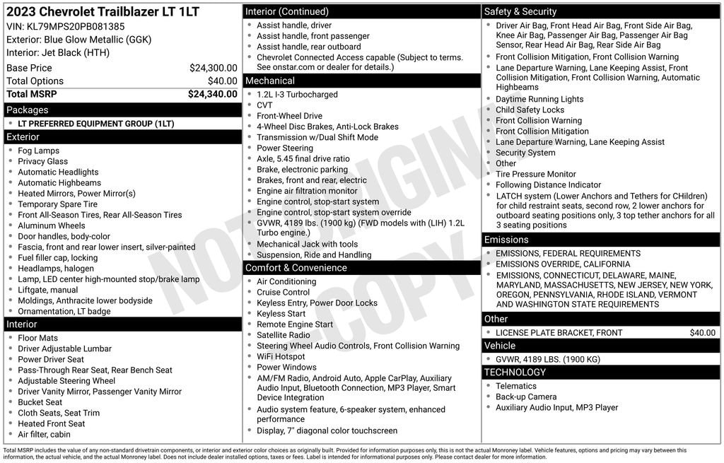 Blue Glow Metallic 2023 Chevrolet TrailBlazer LT 4D Sport Utility FWD CVT 1.2L Ecotec Turbo DOHC DI w/VVT 29/31 City/Highway MPGFinal price includes all Factory Incentives.