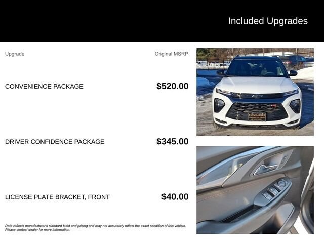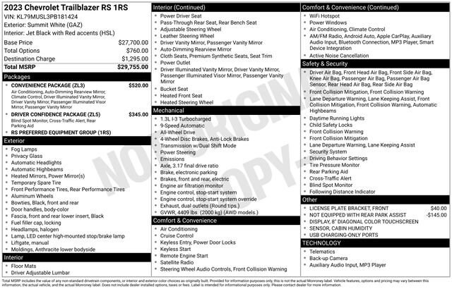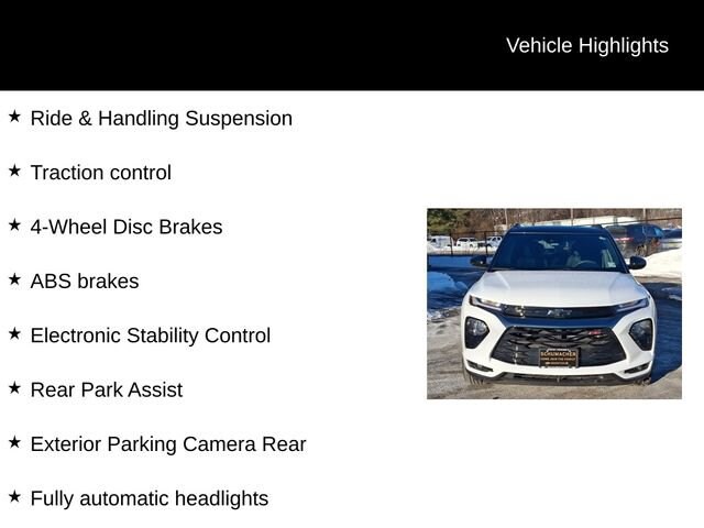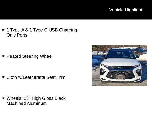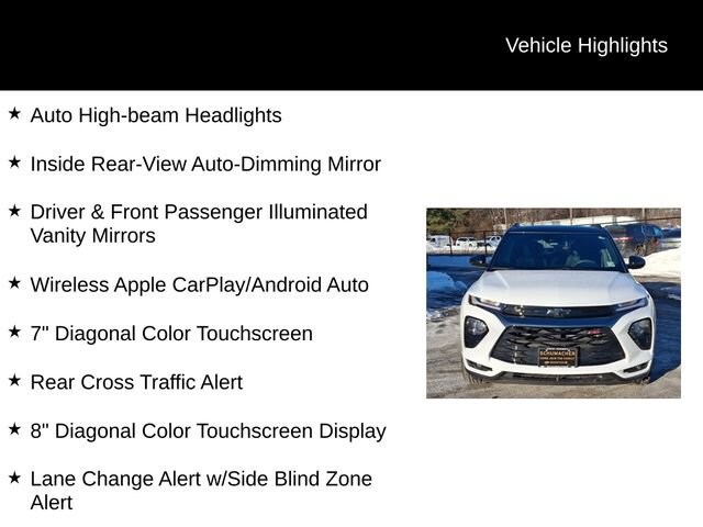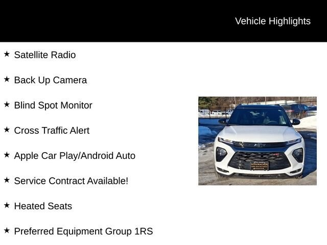 Discover the 2023 Chevrolet TrailBlazer RS, a versatile and well-equipped SUV that's ready to elevate your driving experience. With its sleek exterior, advanced technology, and impressive performance, this TrailBlazer is the perfect companion for your adventures.Packed with desirable features, the TrailBlazer RS stands out from the crowd. Enjoy the convenience of Satellite Radio, the reassurance of a Blind Spot Monitor and Cross Traffic Alert, and the seamless connectivity of Apple CarPlay and Android Auto. Stay comfortable with Heated Seats, and take advantage of the available Service Contract for added peace of mind. Satellite Radio Back Up Camera Blind Spot Monitor Cross Traffic Alert Apple CarPlay/Android Auto Heated Seats Convenience Package Driver Confidence Package Preferred Equipment Group 1RS 6-Speaker Audio System Feature w/Amplifier Radio: Chevrolet Infotainment 3 System SiriusXM Radio Single-Zone Auto Climate Control Air Conditioning 120-Volt Power Outlet 8-Way Power Driver Seat AdjusterBeneath the sleek exterior, the TrailBlazer RS is powered by a 1.3L Ecotec Turbo DOHC SIDI engine with VVT, delivering an impressive 26 city/30 highway MPG. The 9-Speed Automatic transmission and standard All-Wheel Drive provide a smooth and confident driving experience, no matter the conditions.Inside, the TrailBlazer RS offers a spacious and well-appointed cabin, with features like an 8-inch Diagonal Color Touchscreen Display, Wireless Apple CarPlay and Android Auto, and a Heated Steering Wheel for added comfort. The Cloth with Leatherette Seat Trim provides a premium feel, while the 18-inch High Gloss Black Machined Aluminum Wheels give the SUV a bold, stylish presence.Safety is also a top priority, with features like Lane Change Alert with Side Blind Zone Alert, Rear Cross Traffic Alert, and Rear Park Assist keeping you and your loved ones protected.Experience the perfect balance of style, technology, and capability in the 2023 Chevrolet TrailBlazer RS. Visit our showroom today and let us demonstrate how this exceptional SUV can elevate your driving experience.