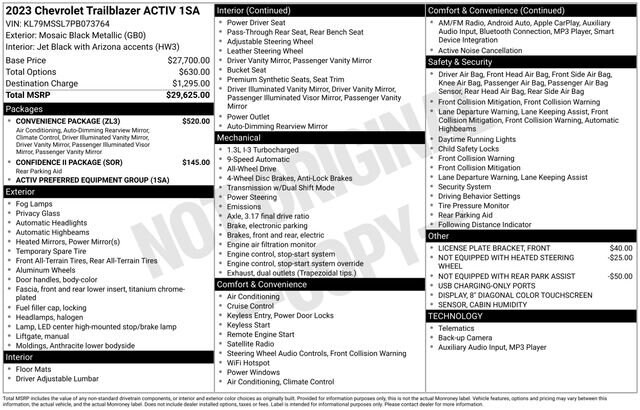 Elevate your driving experience with this 2023 Chevrolet TrailBlazer ACTIV. This versatile and capable SUV is designed to take you on thrilling adventures while providing the comfort and convenience you deserve.Packed with an impressive array of features, this TrailBlazer ACTIV is equipped to enhance your driving experience. Key highlights include:- Convenience Package- Confidence II Package- Preferred Equipment Group 1SA- 6-Speaker Audio System Feature with Amplifier- Chevrolet Infotainment 3 System with 8 Diagonal Color Touchscreen Display- SiriusXM Radio- Single-Zone Automatic Climate Control- 120-Volt Power Outlet- Remote Keyless Entry- Steering Wheel Mounted Audio Controls- Rear Park Assist- Auto High-Beam Headlights- Wireless Apple CarPlay and Android AutoPowered by a 1.3L Ecotec Turbo DOHC SIDI engine with VVT and paired with a 9-speed automatic transmission, this TrailBlazer ACTIV delivers an exceptional blend of performance and efficiency. With an EPA-estimated 26 city/30 highway MPG, you can conquer the daily commute and weekend adventures with ease.The sleek Black exterior, complemented by the Summit White Two-Tone Roof, gives the TrailBlazer ACTIV a bold and distinctive presence. Step inside and you'll be greeted by the premium Leatherette Seat Trim, Heated Front Seats, and Heated Steering Wheel, ensuring your comfort is never compromised.Safety is paramount, and this TrailBlazer ACTIV comes equipped with a suite of advanced driver-assistance features, including Rear Park Assist, Exterior Parking Camera Rear, and Electronic Stability Control, to give you peace of mind on the road.Whether you're embarking on a family road trip, navigating the city streets, or exploring the great outdoors, this 2023 Chevrolet TrailBlazer ACTIV is the perfect companion. Experience the perfect balance of style, capability, and convenience. Visit our showroom today and let us demonstrate why this TrailBlazer ACTIV is the ideal choice for your next vehicle.