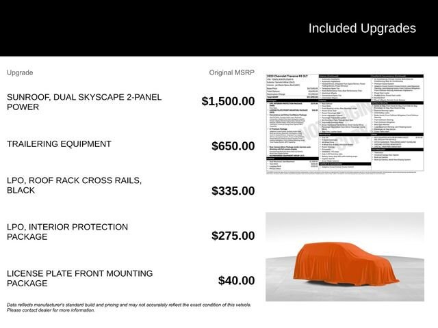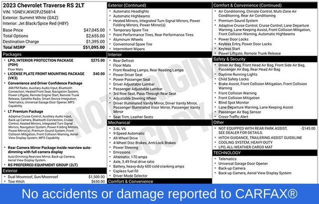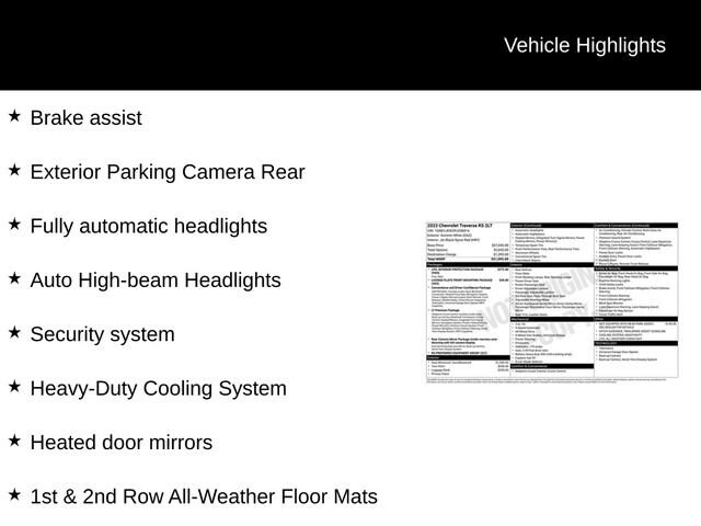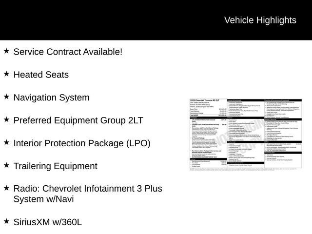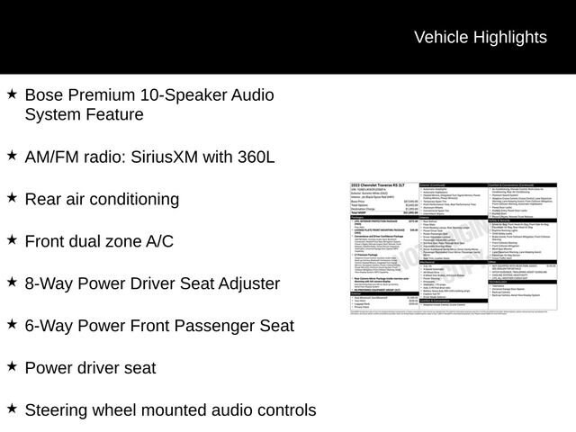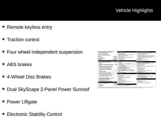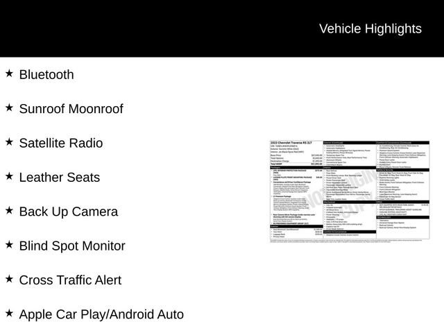 Discover the exceptional 2023 Chevrolet Traverse RS, a versatile and well-equipped SUV that seamlessly blends style, performance, and cutting-edge technology. This stunning vehicle is the perfect companion for your adventures, whether you're embarking on a family road trip, navigating the urban landscape, or tackling the great outdoors.Boasting a sleek and modern exterior in a striking White color, the Traverse RS commands attention wherever it goes. Under the hood, the powerful 3.6L V6 SIDI VVT engine, paired with a 9-Speed Automatic transmission and All-Wheel Drive, delivers an exhilarating driving experience with an impressive fuel efficiency of 17 city MPG and 25 highway MPG.- Apple CarPlay/Android Auto- Back Up Camera- Blind Spot Monitor- Bluetooth- Cross Traffic Alert- Heated Seats- Leather Seats- Satellite Radio- Sunroof Moonroof- Dual SkyScape 2-Panel Power Sunroof- Trailering Equipment- Interior Protection Package (LPO)The Traverse RS is equipped with a wealth of premium features that elevate your driving experience. Indulge in the convenience of the Bose Premium 10-Speaker Audio System, the intuitive Chevrolet Infotainment 3 Plus System with Navigation, and the added safety of the Rear Parking Camera and Hitch Guidance with Hitch View. Stay connected and entertained with seamless integration of your smartphone via Apple CarPlay and Android Auto.Comfort and versatility are at the forefront of the Traverse RS design. Sink into the plush, perforated Leather-Appointed Seats, which are both heated and power-adjustable, ensuring a personalized driving position. The Dual-Zone Automatic Climate Control and Heated Steering Wheel provide year-round comfort, while the Split-Bench Third-Row Seating offers ample room for passengers and cargo.Safety is paramount in the Traverse RS, with features like Forward Collision Alert, Lane Keep Assist with Lane Departure Warning, and Automatic Emergency Braking keeping you and your loved ones secure on the road. The Blind Spot Monitor and Rear Cross-Traffic Alert further enhance your awareness, while the Trailering Equipment package provides the confidence to tow your toys with ease.Experience the exceptional 2023 Chevrolet Traverse RS and discover the perfect blend of style, performance, and technology. Visit our showroom today to take this remarkable SUV for a test drive and see how it can elevate your driving experience.