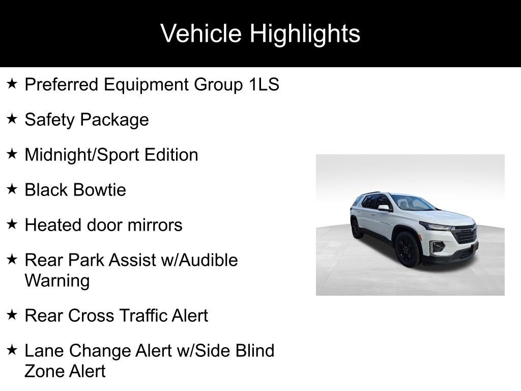 Odometer is 13597 miles below market average!Traverse LS, 3.6L V6 SIDI VVT, 9-Speed Automatic, AWD, Summit White, Jet Black/Chai Cloth, Apple CarPlay/Android Auto, Black Bowtie, Black Roof Rails, Heated door mirrors, Lane Change Alert w/Side Blind Zone Alert, Midnight/Sport Edition, Preferred Equipment Group 1LS, Rear Cross Traffic Alert, Rear Park Assist w/Audible Warning, Safety Package, Wheels: 18 Gloss Black Painted Aluminum.Summit White 2023 Chevrolet Traverse LS 4D Sport Utility AWD 9-Speed Automatic 3.6L V6 SIDI VVTDon't hesitate...a deal like this doesn't last forever! Reach out to us at 1-855-958-3198 to speak with one of our customer friendly product specialists to schedule the test drive of YOUR next vehicle!
