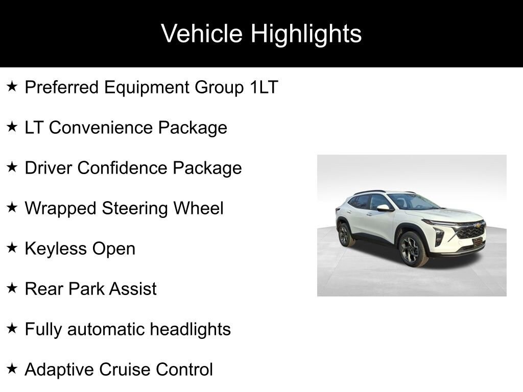 Trax LT, 1.2L Ecotec Turbo DOHC DI w/VVT, 6-Speed Automatic, FWD, Summit White, Jet Black With Yellow Accents Cloth, Adaptive Cruise Control, Driver Confidence Package, Fully automatic headlights, Heated Driver & Front Passenger Seats, Heated Power-Adjustable Outside Mirrors, Heated Steering Wheel, Keyless Open, Lane Change Alert w/Side Blind Zone Alert, LT Convenience Package, Preferred Equipment Group 1LT, Rear Cross-Traffic Alert, Rear Park Assist, Wrapped Steering Wheel.