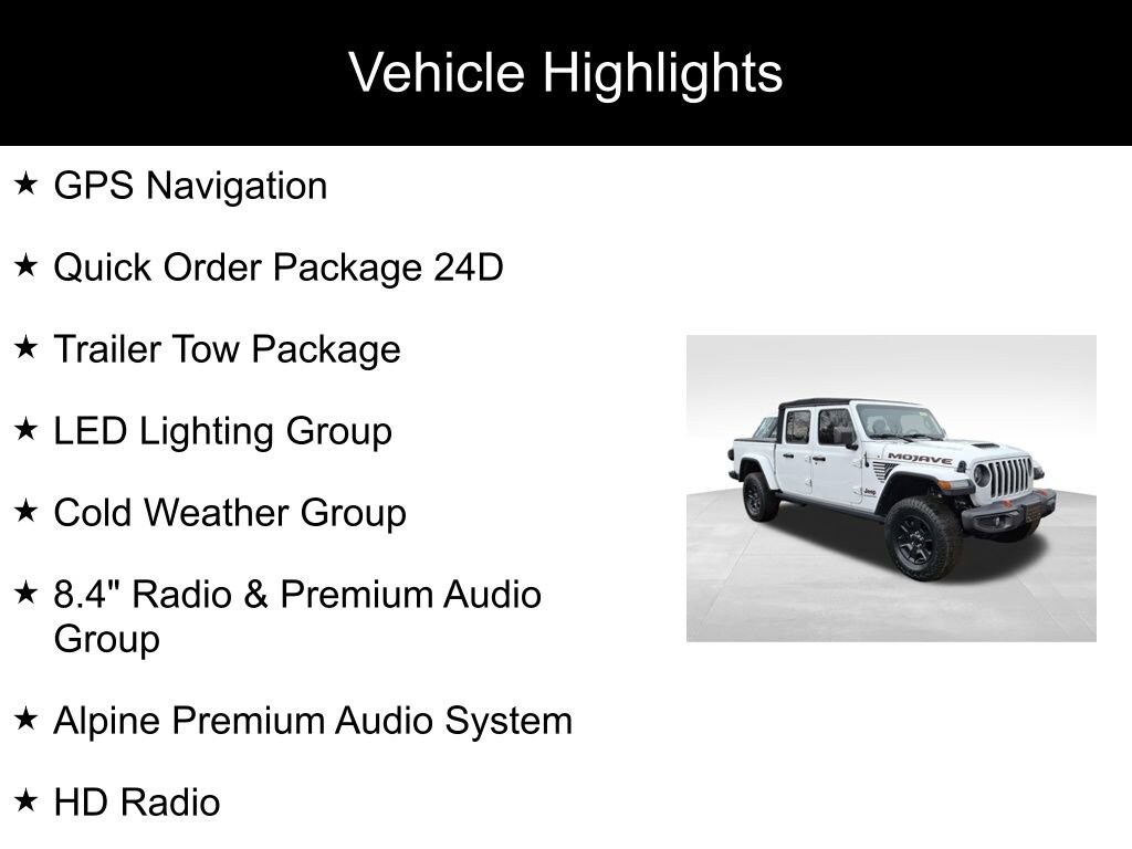 Gladiator Mojave, 3.6L V6 24V VVT, 8-Speed Automatic, 4WD, Bright White Clearcoat, Black Cloth, 1-Year SiriusXM Guardian Trial, 240 Amp Alternator, 5-Year SiriusXM Traffic Service, 5-Year SiriusXM Travel Link Service, 8.4 Radio & Premium Audio Group, 8.4 Touchscreen Display, Alpine Premium Audio System, Apple CarPlay/Android Auto, Auto-Dimming Rear-View Mirror, Class IV Hitch Receiver, Cold Weather Group, Daytime Running Lamps LED Accents, Emergency/Assistance Call, For Details, Visit DriveUconnect.com, Front fog lights, Front LED Fog Lamps, Fully automatic headlights, GPS Navigation, HD Radio, Heated door mirrors, Heated Front Seats, Heated Steering Wheel, Heavy-Duty Engine Cooling, LED Lighting Group, LED Park Turn Lamps, LED Premium Reflector Headlamps, LED Taillamps, MOPAR Spray In Bedliner, ParkView Rear Back-Up Camera, Quick Order Package 24D, Radio: Uconnect 4C Nav w/8.4 Display, Remote Start System, SiriusXM Traffic Plus, SiriusXM Travel Link, Trailer Hitch Zoom, Trailer Tow Package.