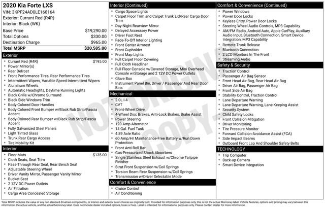 Currant Red 2020 Kia Forte LXS 4D Sedan FWD CVT 2.0L 4-Cylinder MPI 29/40 City/Highway MPG