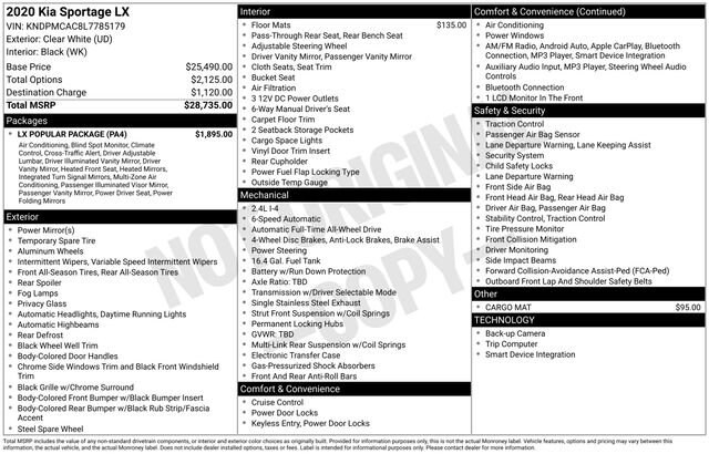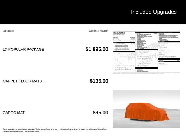 Designed with your active lifestyle in mind, the 2020 Kia Sportage LX offers ample cargo space and a versatile interior. The available Cargo Mat and Carpet Floor Mats help protect your investment, while the 60/40 split-folding rear seats provide the flexibility to accommodate your ever-changing needs.