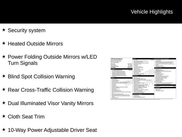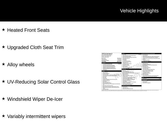 Beyond its dynamic driving characteristics, the Sportage LX pampers you with a wealth of premium features. The LX Popular Package elevates your comfort and convenience with dual-zone climate control, heated front seats, and a 10-way power-adjustable driver's seat. Stay connected with Apple CarPlay and Android Auto, while the Blind Spot Collision Warning and Rear Cross-Traffic Collision Warning systems help keep you safe.
