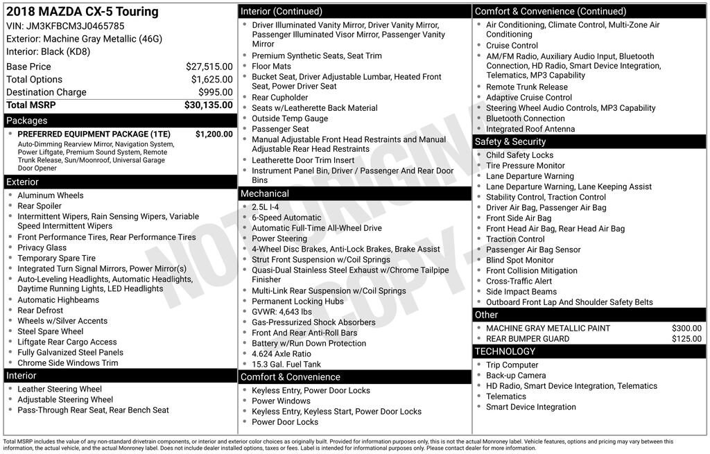 Machine Gray Metallic 2018 Mazda CX-5 Touring 4D Sport Utility AWD 6-Speed Automatic SKYACTIV® 2.5L 4-Cylinder DOHC 16V 24/30 City/Highway MPG
